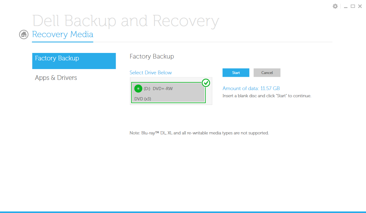 After running the "Factory Backup" click on the "Apps & Drivers". Now insert a blank DVD and click "Start". Again the process will take a little while but at least you will have a backup of all the applications that were installed when you bought the computer.